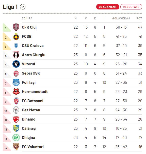 Locurile 7-14 din sezonul regulat vor continua in play-out. Romania - Clasament Liga 1 2019-2020 program etape - rezultatele statistice la zi oferite de RomanianSoccerro. Romania - Clasament Liga 1 2021-2022 program etape - rezultatele statistice la zi oferite de RomanianSoccerro.